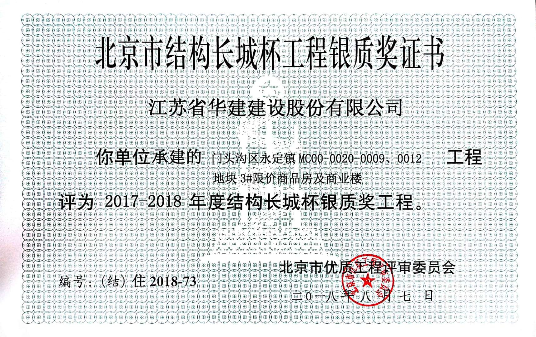 北京公司再獲兩項省級優質結構工程 時間:2018-10-20 3592 近日,北京市工程建設質量管理協會公布了2017-2018年度北京市結構長城杯工程及獲獎單位,由北京公司承建的門頭溝區永定鎮MC00-0020-0009、0012地塊3#限價商品房及商業樓項目獲得結構長城杯銀質獎。 同時,由我司承建的綠城楊柳郡一期17#樓、18#樓、裙房及地下室工程被評定為2018年廣西建設優質結構獎。