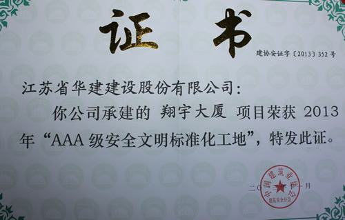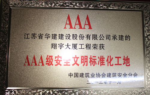 公司首獲全國“AAA級安全文明標準化工地” 時間:2013-12-12 5360 日前,由上海區域公司蘇北分公司承建的淮安翔宇大廈被中國建筑業協會評為2013年全國“AAA級安全文明標準化工地”,這是國內安全文明施工最高獎項,旨在規范建筑施工安全生產,保障建筑職工安全與健康,提高施工現場安全管理水平。這是上海區域公司第一次獲此殊榮,也是江蘇華建第8項全國3A級安全文明標準化工地,該工程還被評為2012年度江蘇省建筑施工文明工地、2013年度江蘇省建筑業新技術應用示范工程。