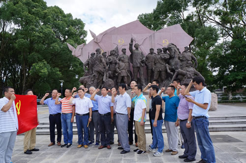上海分公司黨總支組織開展“紅色之旅”教育 時間:2016-08-16 4325 8月12日,上海分公司黨總支組織部分黨員干部和入黨積極分子共18人,赴愛國主義教育基地福建古田開展“促兩學一做,走紅色之旅”教育活動,在“主席園”向毛主席像敬獻花籃,在“豐碑軍魂”雕像前面對黨旗重溫入黨誓詞,還仔細參觀古田會議地址和紀念館,回顧緬懷了老一輩無產階級革命家的不朽事跡。大家牢記“古田會議永放光芒”精神,紛紛表示:“不忘初心,繼續前行”。