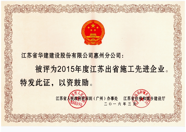惠州公司榮獲“2015年度江蘇出省施工先進企業”稱號 時間:2016-03-26 3069 3月24日,江蘇省人民政府駐深圳(廣州)辦事處和江蘇省住房和城鄉建設廳在南寧召開2016年江蘇建筑業南方區工作會議,表彰了一批施工先進企業、優秀企業經理、優秀建造師和先進個人?;葜莨?/SPAN>獲評“2015年度江蘇出省施工先進企業”,總經理華恒榮被評為優秀企業經理,陳申高被表彰為質量安全先進個人,楊猛被表彰為經營財務先進個人。