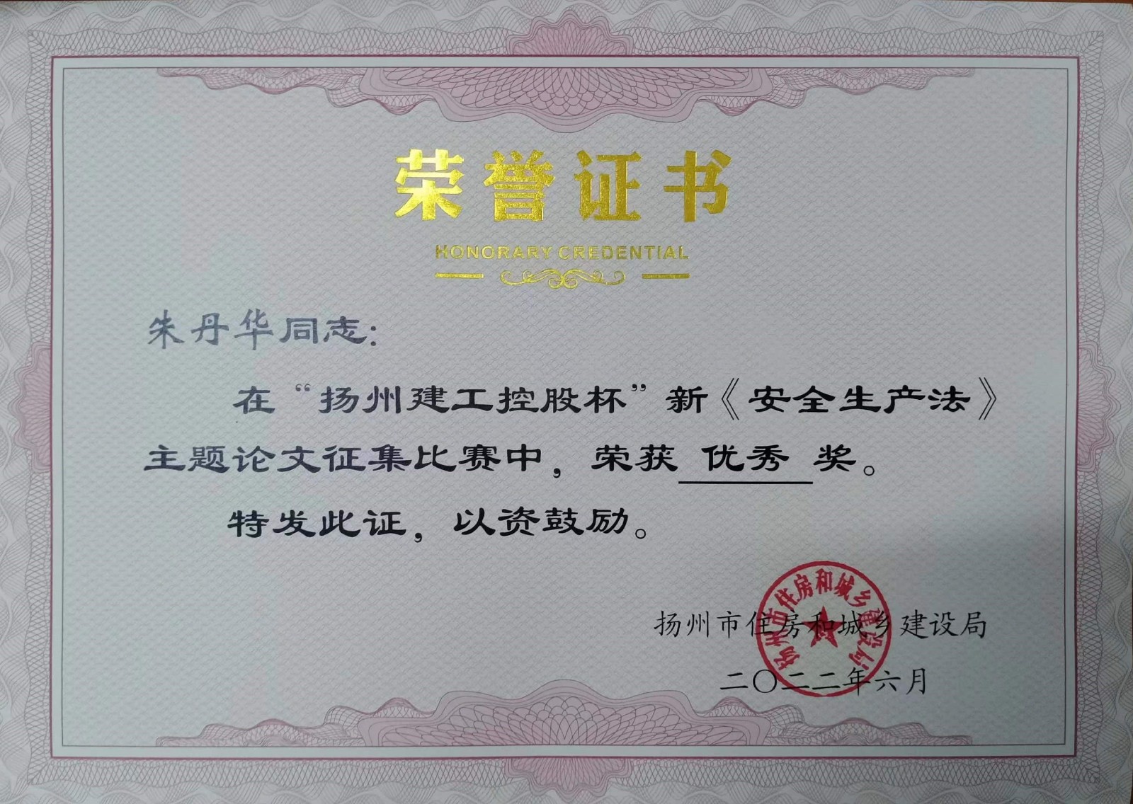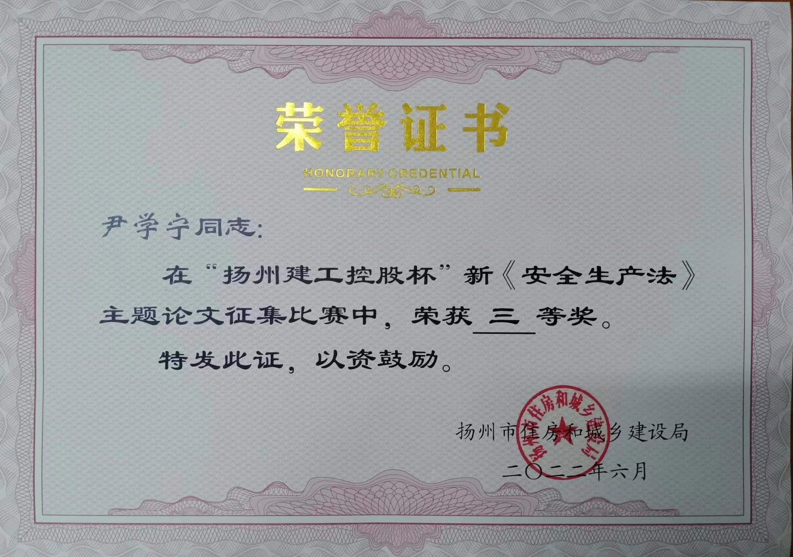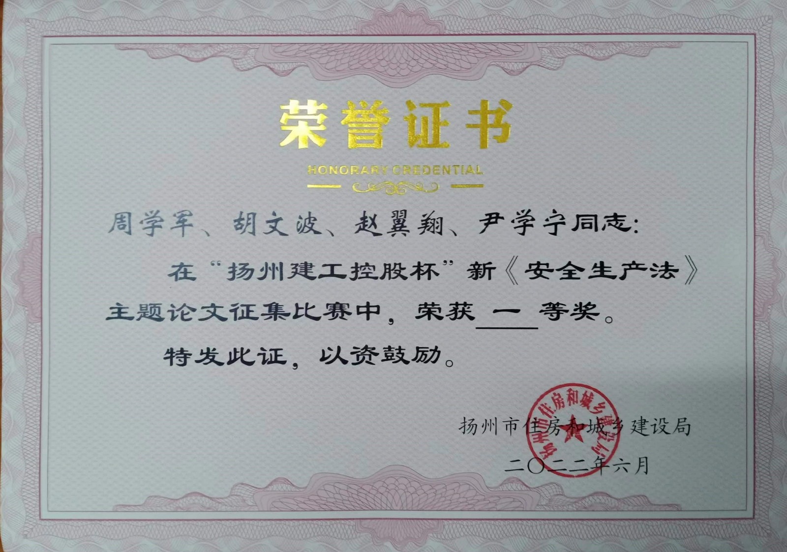 北京分公司4篇論文獲揚州市新《安全生產法》主題論文征文比賽獎項 時間:2022-07-16 4272 近日,從揚州市住房和城鄉建設局傳來喜訊,由北京公司投稿的4篇論文榮獲“揚州建工控股杯”新《安全生產法》主題論文征文比賽獎項,并獲頒證書,其中一等獎一項,三等獎一項,優秀論文獎兩項。