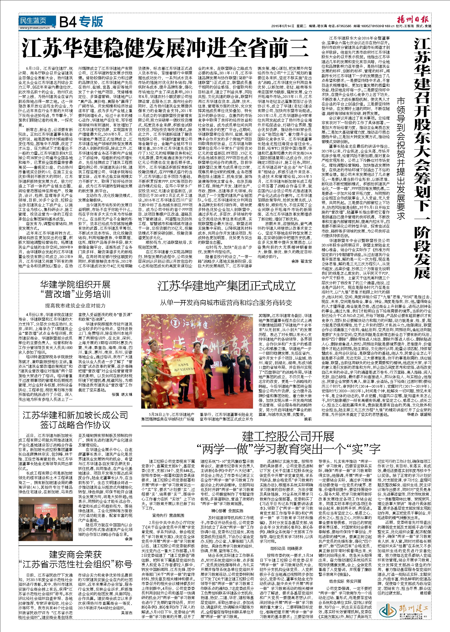今日《揚州日報》刊登專版文章報道華建進入全省前三有關消息 時間:2016-06-14 4551 今天出版的《揚州日報》B4“揚州建工”專版刊登了江蘇華建穩健發展沖進全省前三、華建股東大會、華建地產集團成立、“兩學一做”學習教育等相關文章,歡迎關注。