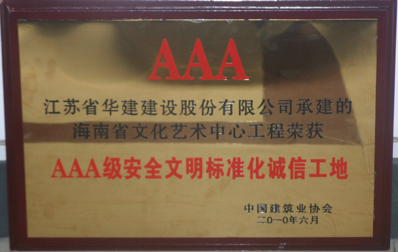 “海南省文化藝術中心”項目榮膺全國AAA級安全文明標準化誠信工地 時間:2010-07-24 5435 近日,經中國建筑業協會建筑安全分會在專家評審、組織抽查和網上公示,海南公司承建的海南省文化藝術中心工程榮膺全國“AAA級安全文明標準化誠信工地”,這是海南公司近年來首次獲得此項榮譽。 該項目自開工以來,以摘取魯班獎為最高質量目標,積極策劃,精心組織,以過程創精品,狠抓細部施工,各項指標始終處于受控狀態,多次接受省、市領導、專家、同行的現場觀摩,獲得業內高度評價。
