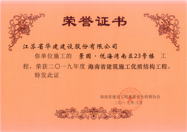 近日,海南省建設工程質量安全監測協會發文表彰了一批2019年度上半年海南省建筑施工優質結構工程,江蘇華建海南分公司承建的3個項目上榜,分別是:三亞奧林匹克廣場項目、中國電科海洋信息產業基地項目(B01-03地塊培訓交流中心)項目、景園悅海灣二期南區23#樓項目。
