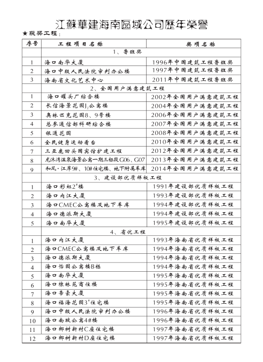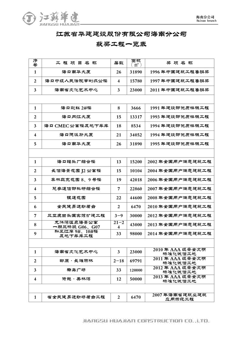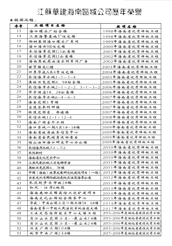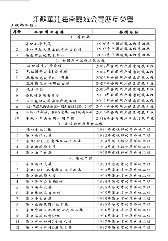 獲獎工程一覽 時間:2019-01-01 13644 魯班獎 全國用戶滿意建筑工程 全國AAA級安全文明標(biāo)準(zhǔn)化誠信工地 海南省優(yōu)質(zhì)樣板工程 湖北省建筑優(yōu)質(zhì)工程