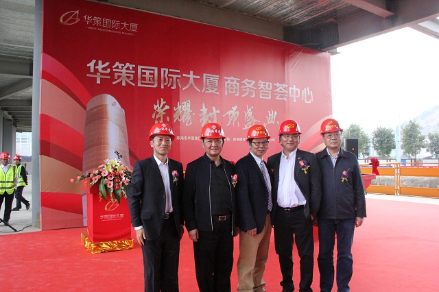 2017年1月9日,第八項目部承擔施工任務的華策國際大廈項目舉行主體結構封頂儀式。橫琴新區黨委副書記葉真、橫琴新區建設環保局局長劉晨光,華策集團董事局主席楊峰、副主席楊智雄、總裁余道群,江蘇華建副董事長、總經理宗有農、珠海公司總經理繆國樞、深圳公司常務副總吳碧橋、深圳公司副總經理蔣超,以及來自華策集團、設計單位、參建單位、監理單位和珠海區域公司相關人員共200余人出席儀式。華策國際大廈整體分為東塔和西塔兩部分,西塔已于2016年11月8日封頂,隨著東塔的順利封頂,華策國際大廈全面封頂,并將于2017年部分投入使用,2018年底全部投入使用。