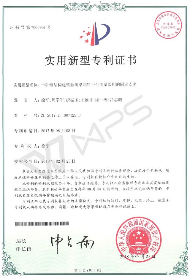 近日,從國(guó)家知識(shí)產(chǎn)權(quán)局傳來(lái)喜訊,公司申請(qǐng)的《一種鋼結(jié)構(gòu)建筑懸挑梁卸料平臺(tái)主梁端用的固定支座》獲得實(shí)用新新型專利授權(quán)。