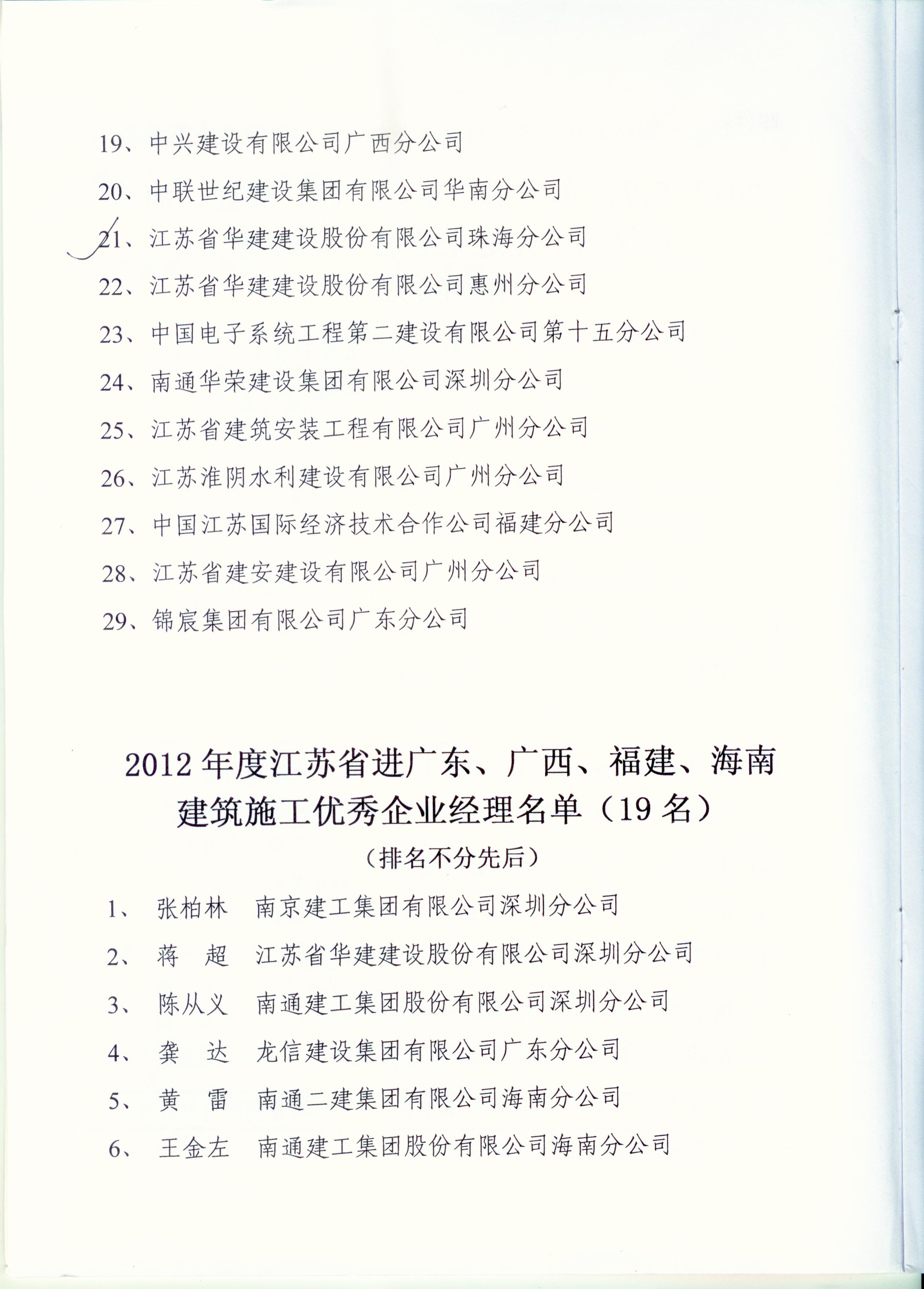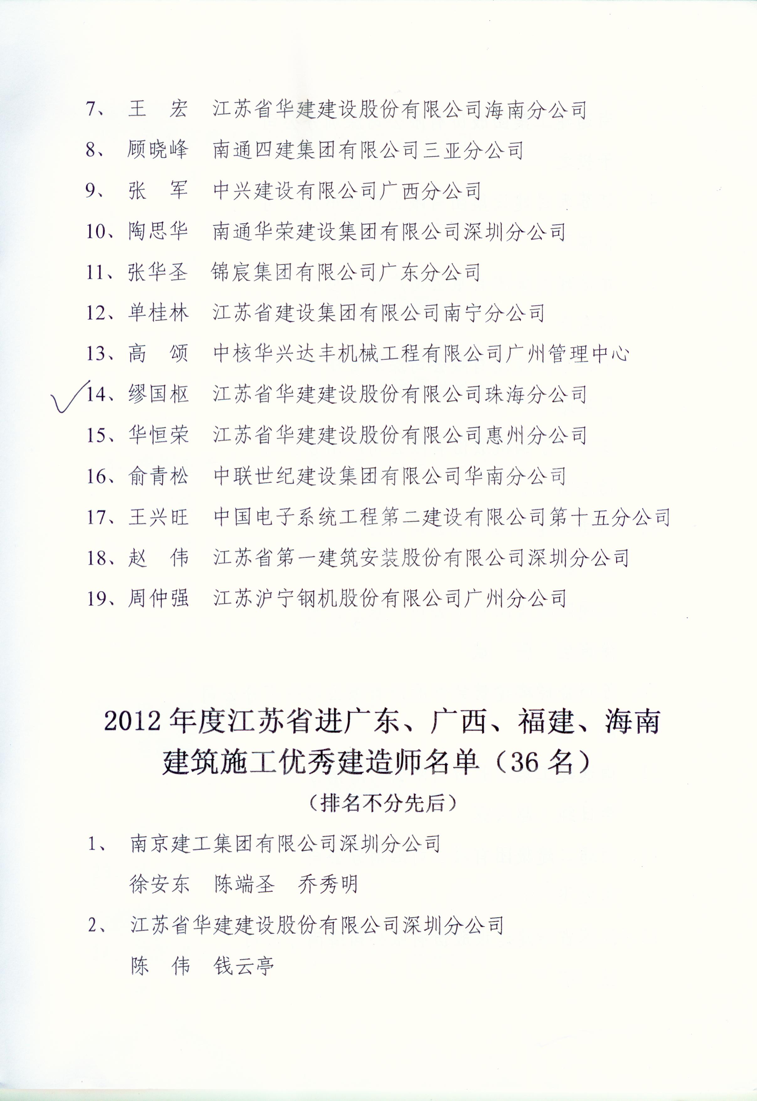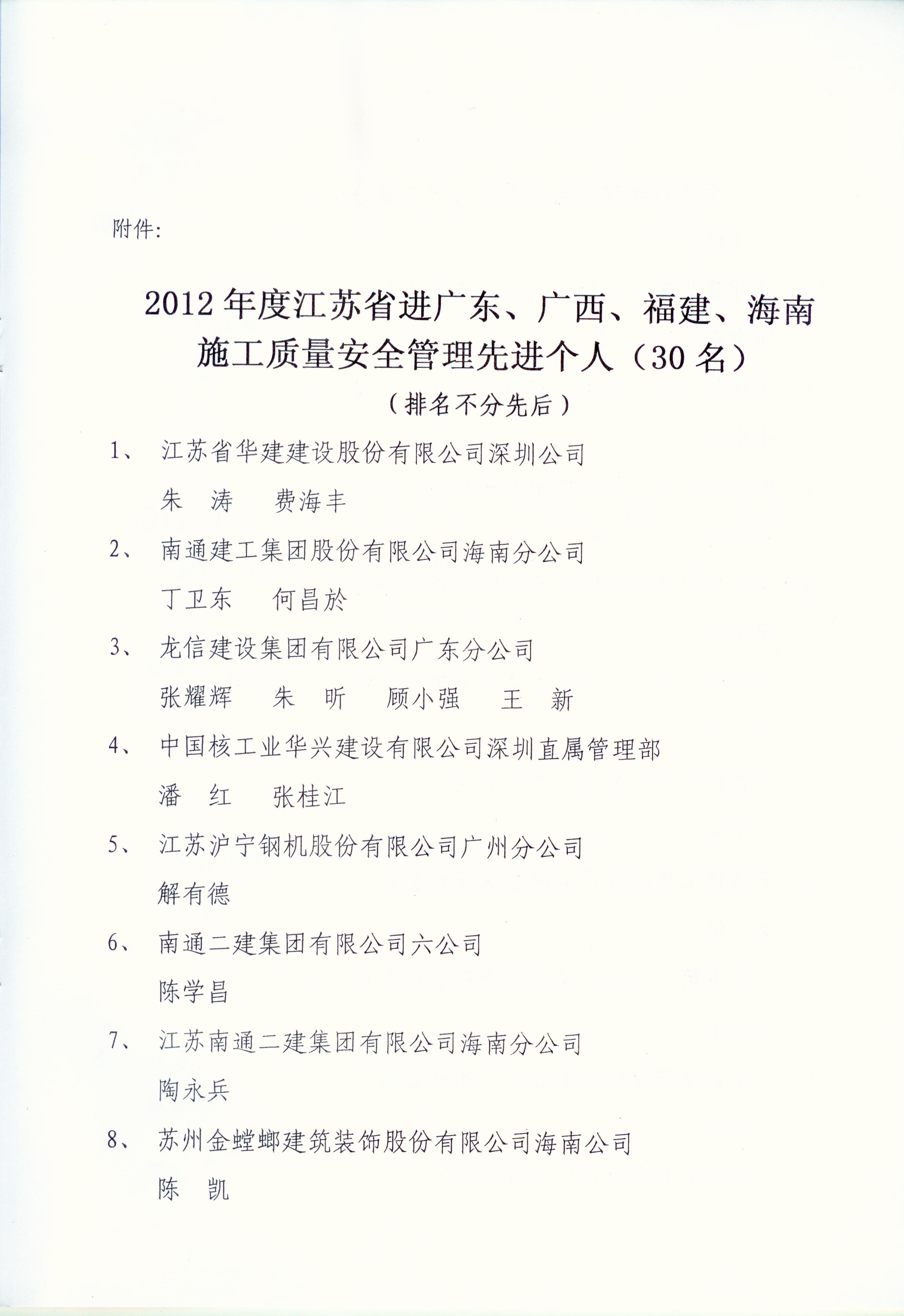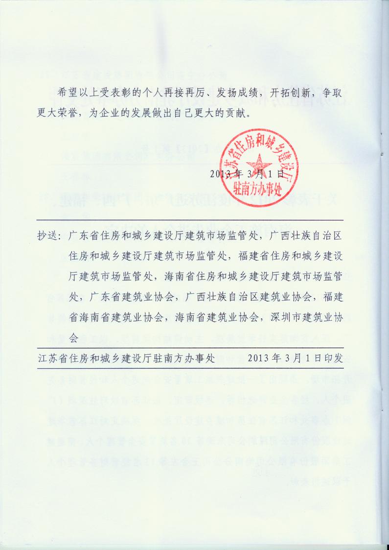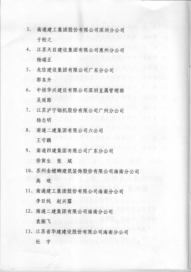 2012年江蘇進(jìn)粵、桂、閩、瓊建筑施工先進(jìn)企業(yè)、優(yōu)秀企業(yè)經(jīng)理、優(yōu)秀建造師及經(jīng)營(yíng)財(cái)務(wù)管理、質(zhì)量安全管理先進(jìn)個(gè)人 時(shí)間:2013-03-18 4476