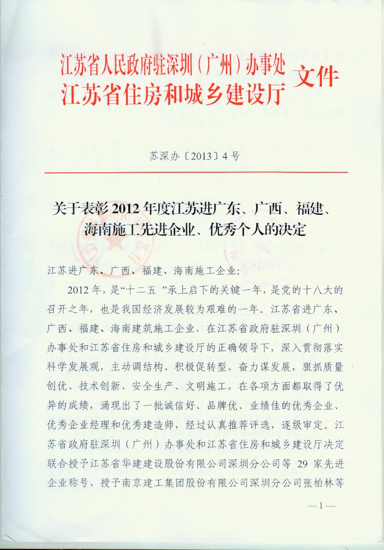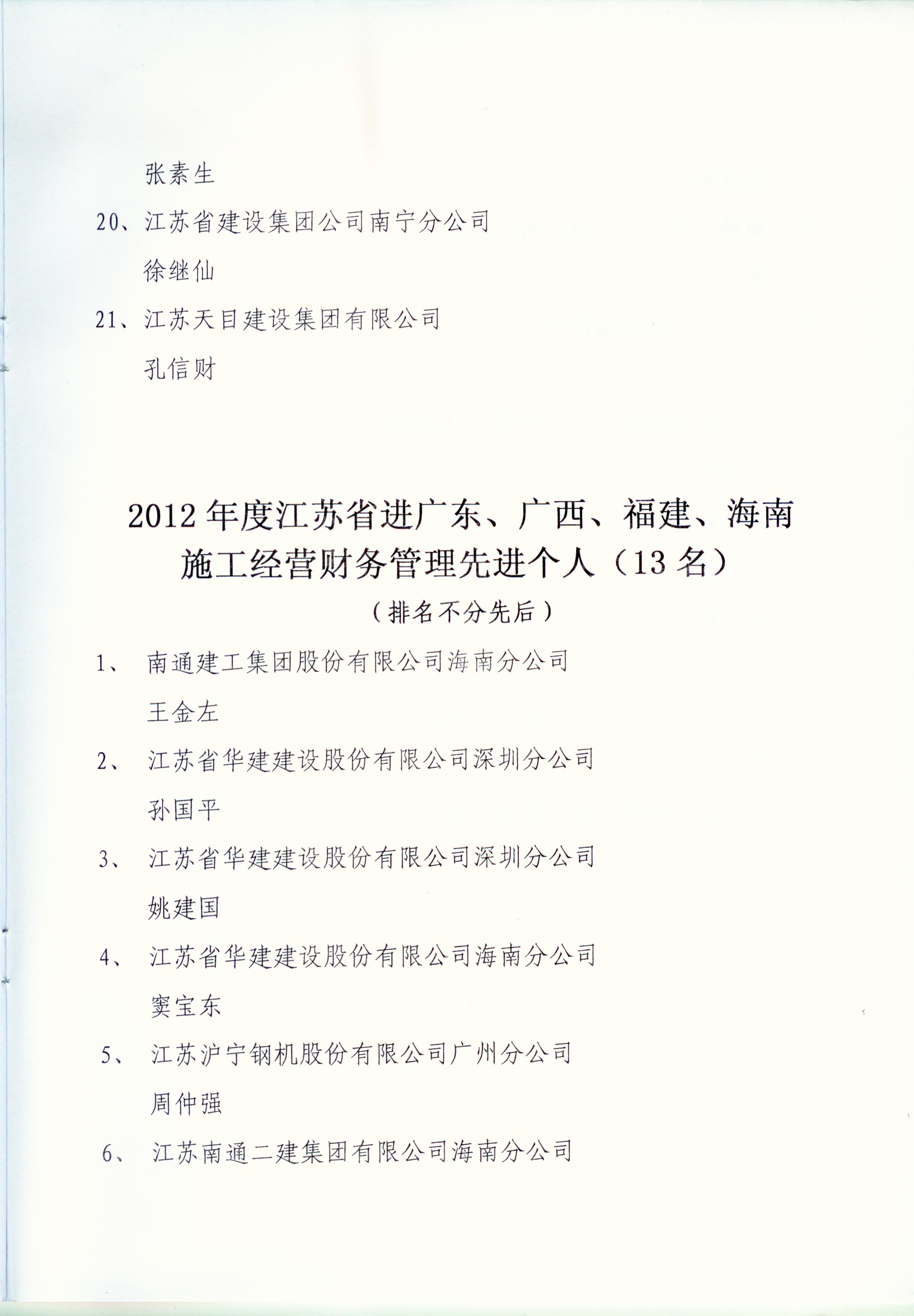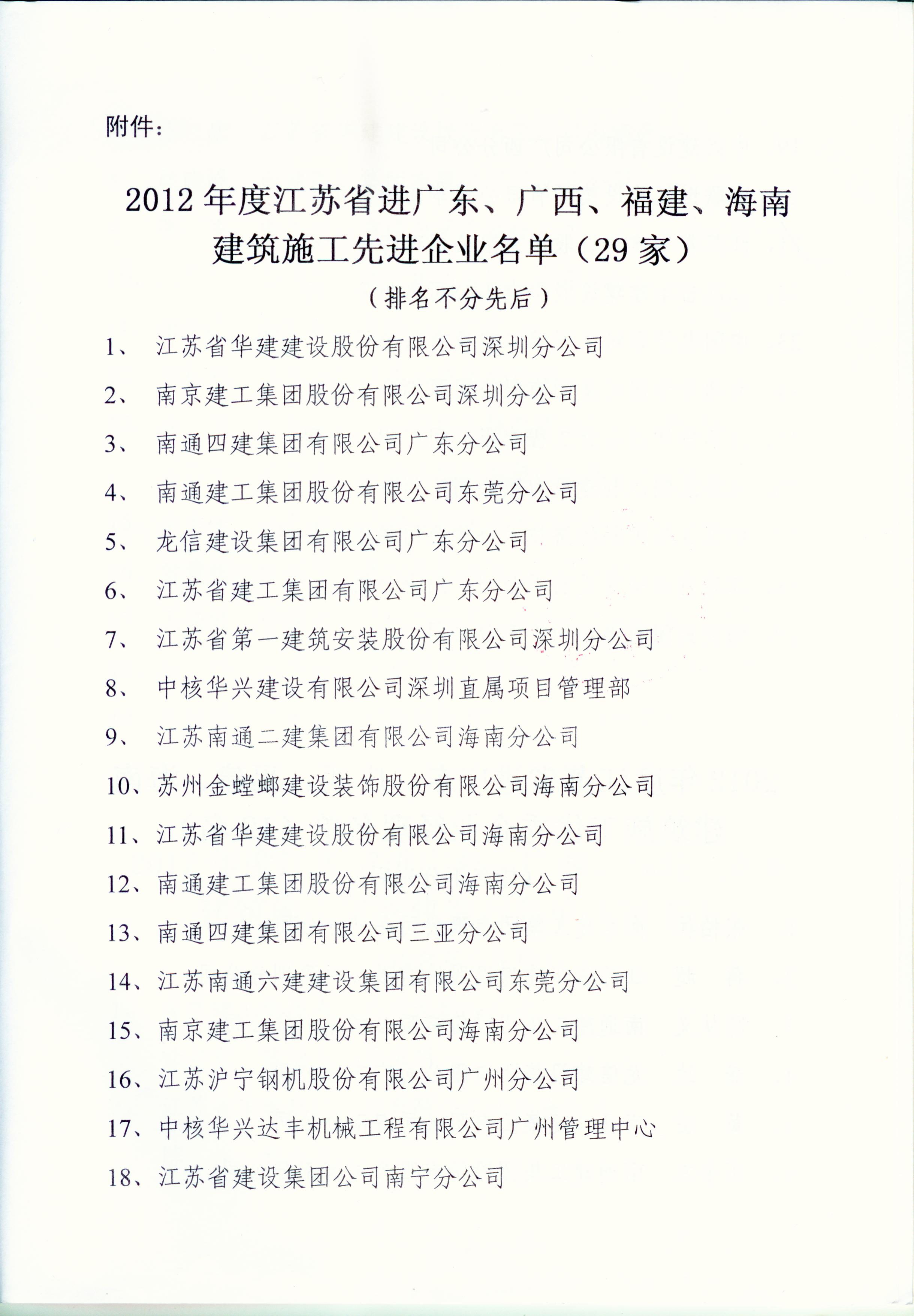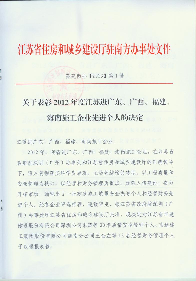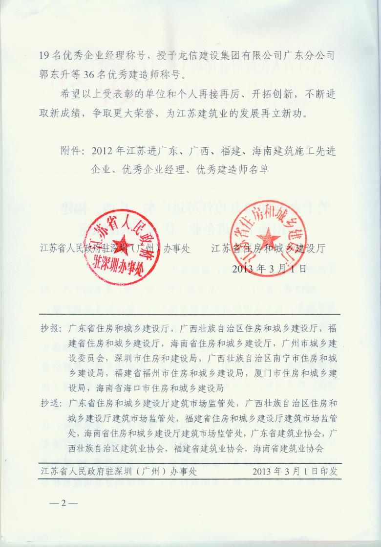 2012年江蘇進(jìn)粵、桂、閩、瓊建筑施工先進(jìn)企業(yè)、優(yōu)秀企業(yè)經(jīng)理、優(yōu)秀建造師及經(jīng)營(yíng)財(cái)務(wù)管理、質(zhì)量安全管理先進(jìn)個(gè)人 時(shí)間:2013-03-18 4476