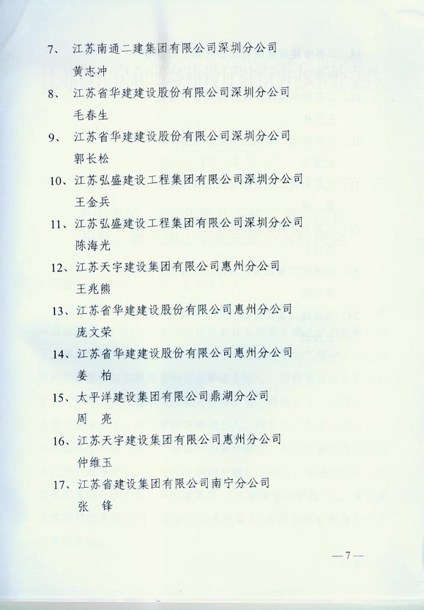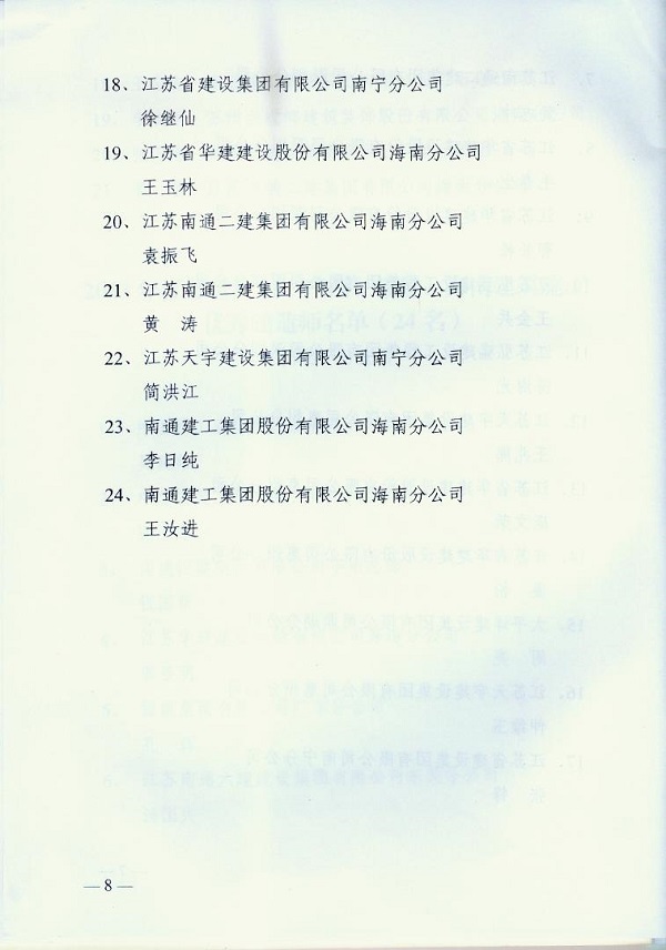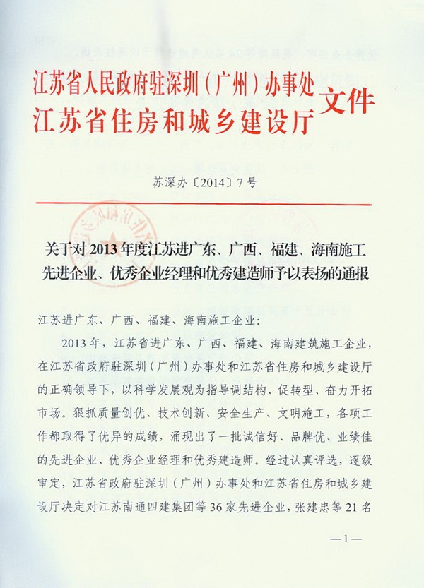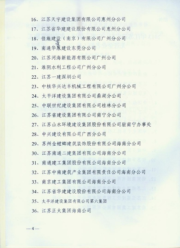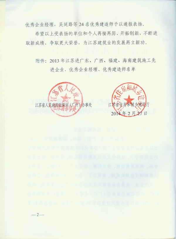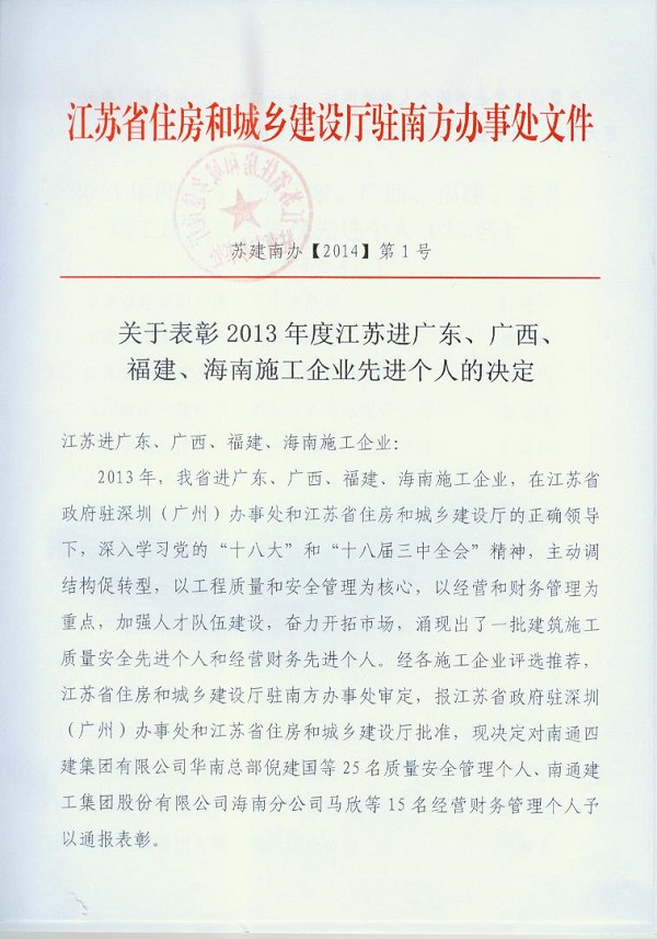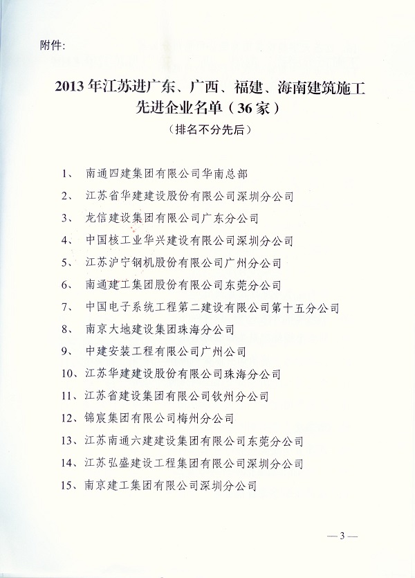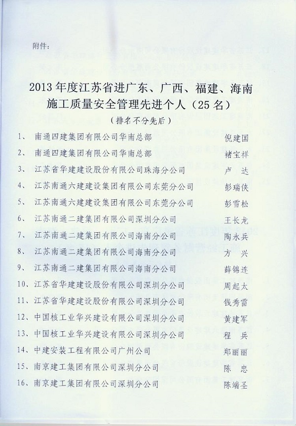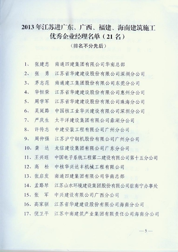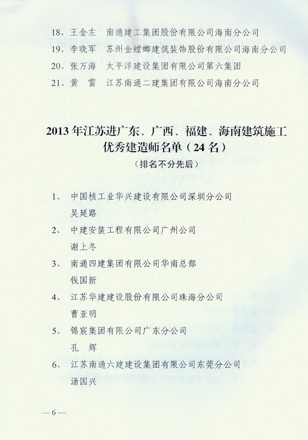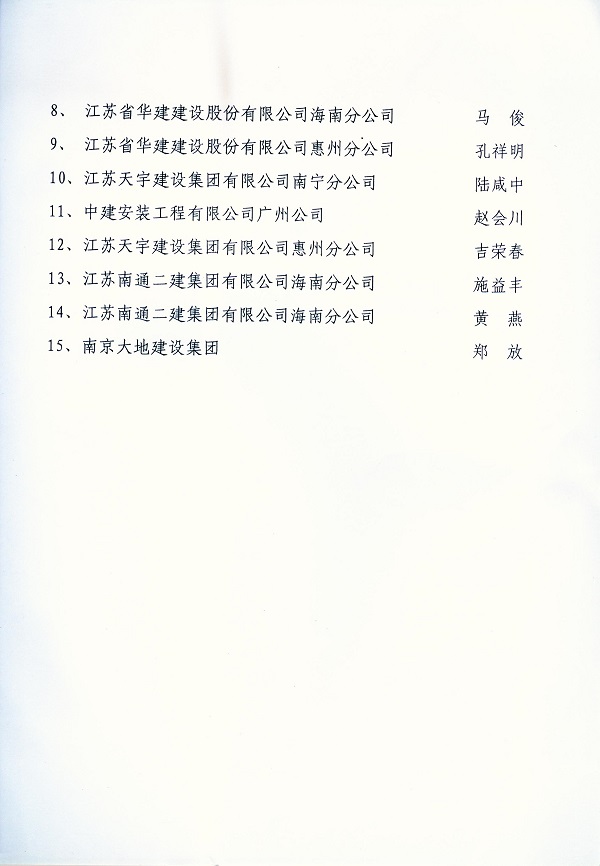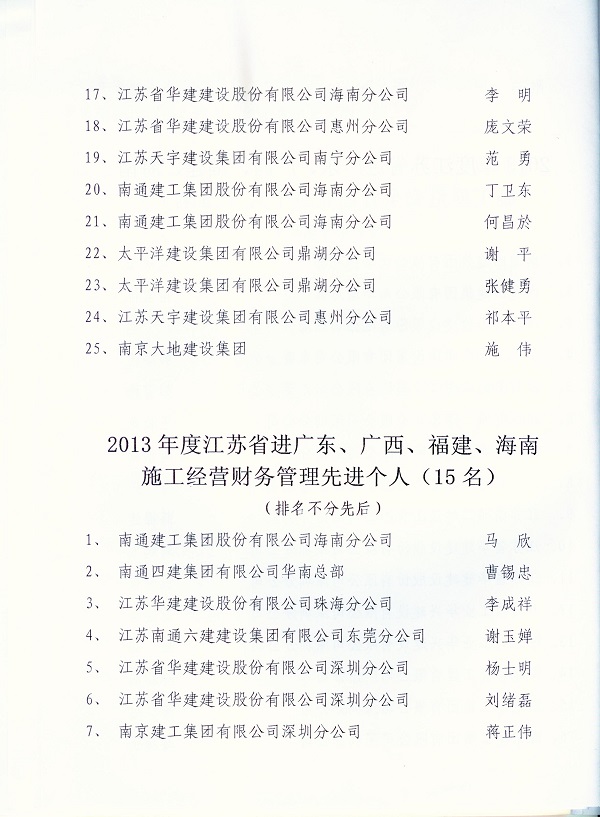 2013年江蘇進粵、桂、閩、瓊建筑施工先進企業(yè)、優(yōu)秀企業(yè)經理、優(yōu)秀建造師及經營財務管理、質量安全管理先進個人