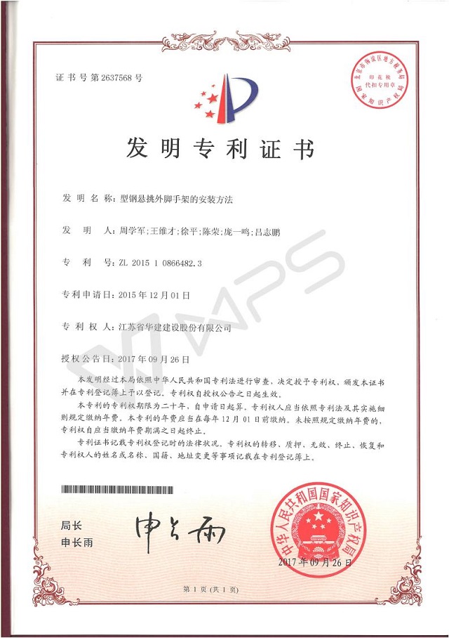 近日,江蘇華建珠海區(qū)域公司《型鋼懸挑外腳手架的安裝方法》獲得國家發(fā)明專利授權,這是珠海區(qū)域...