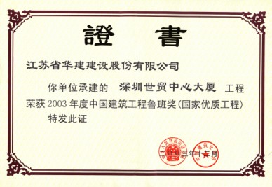 招商銀行大廈工程1998年6月18日開工,2001年9月29日竣工,觀感得分91.9分,評定為“優良工程”;先后榮獲深圳市優質樣板工程“金牛獎”、江蘇省優“揚子杯”、廣東省優良樣板工程,2003年榮獲“中國建筑工程魯班獎”。